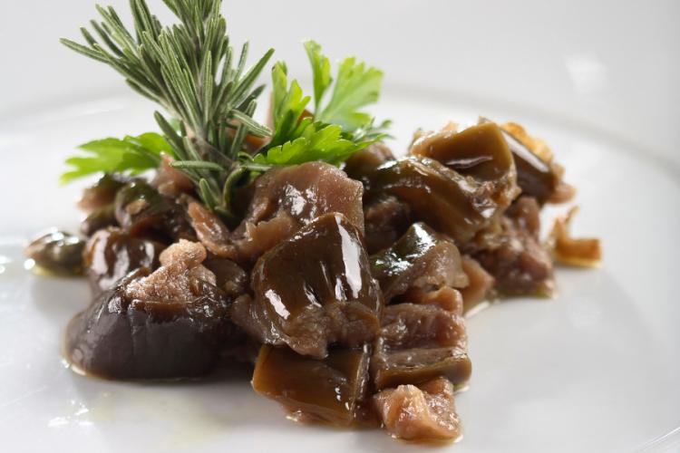 Kroimy bakłażany na niezbyt małą kostkę ( ok. 3 cm), wysypujemy na durszlak i solimy. Zostawiamy na około pół godziny- bakłażany w ten sposób stracą całą goryczkę. Po tym czasie wkładamy je do garnka polewamy octem i gotujemy przez ok. 25 minut. Następnie odcedzamy i zostawiamy na durszlaku przez 10 minut, by dobrze ociekły. Na koniec przekładamy bakłażany na czystą ściereczkę i obsuszamy przez całą noc. Następnego dnia wkładamy je do szklanego słoja do połowy wysokości, dodajemy czosnek pokrojony w płatki i kapary oczyszczone z soli. Zalewamy oliwą z oliwek aż do całkowitego przykrycia bakłażanów, zakręcamy i odstawiamy na minimum 2 miesiące. Jest to znakomita, wyrafinowana przystawka albo dodatek do grzanek.
